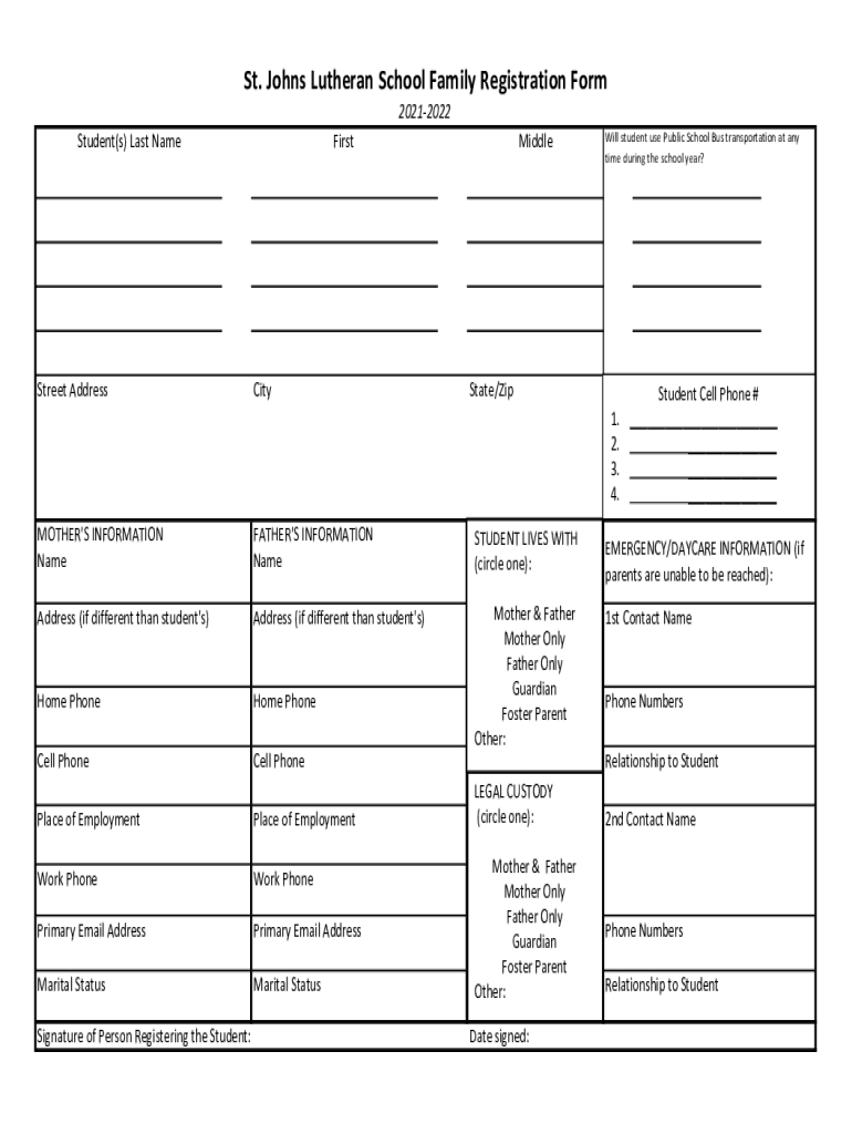 St. Johns Lutheran School Family Registration Form 20212022 Student(s) Last Backstreet AddressFirstCityMiddleWill student use Public School Bus transportation at any time during the school year? State/Zip