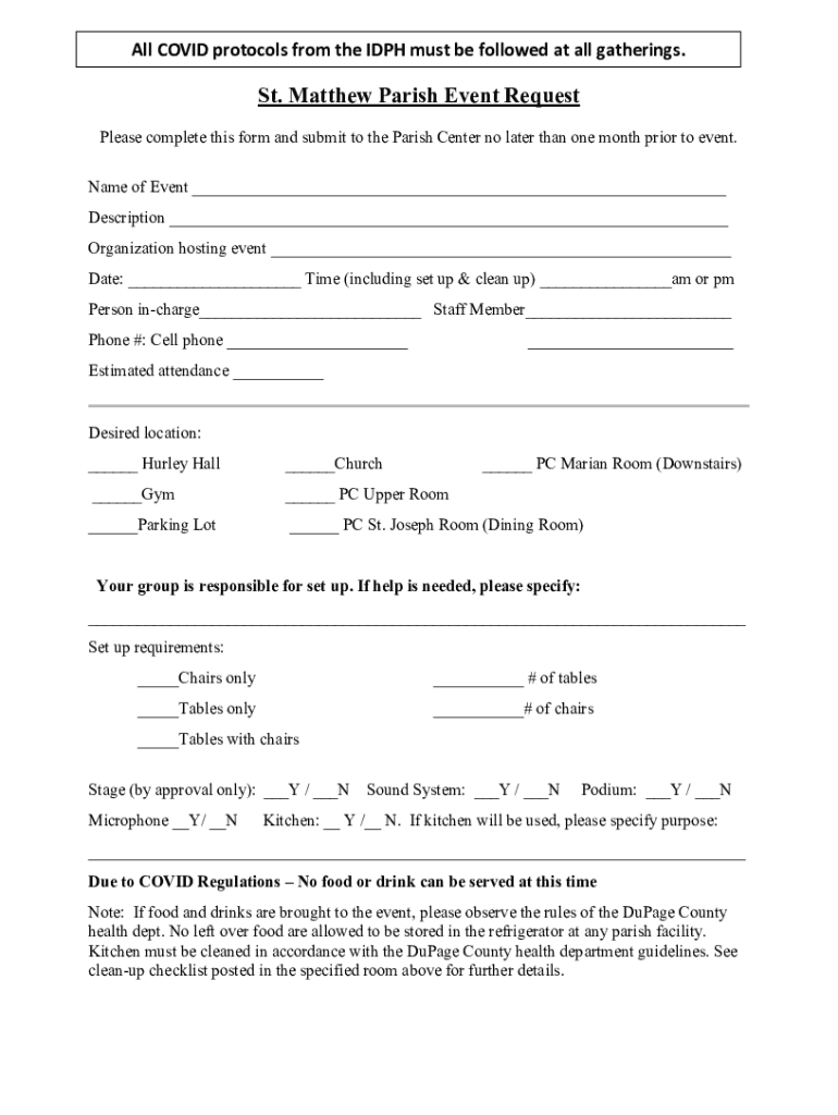 All COVID-19 protocols from the DPH must be followed at all gatherings. St. Matthew Parish Event Request Please complete this form and submit to the Parish Center no later than one month prior to