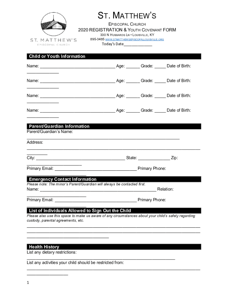 ST. MATTHEWSEPISCOPAL CHURCH 2020 REGISTRATION & YOUTH COVENANT FORM 330 N HUBBARD SLN LOUISVILLE, KY 8953485 WWW.STMATTHEWSEPISCOPALLOUISVILLE.ORGTodays Date Child or Youth Information Name: Age:
