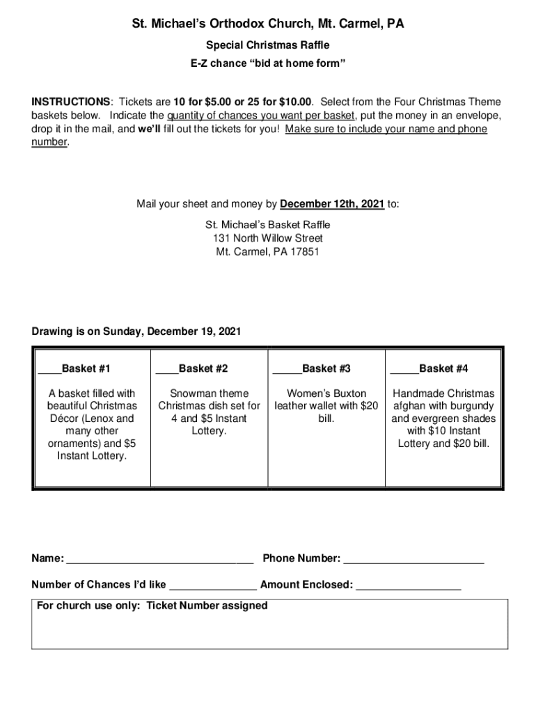 St. Michael's Orthodox Church, Mt. Carmel, PA Special Christmas Raffle EZ chance bid at home formINSTRUCTIONS: Tickets are 10 for $5.00 or 25 for $10.00. Select from the Four Christmas Theme baskets