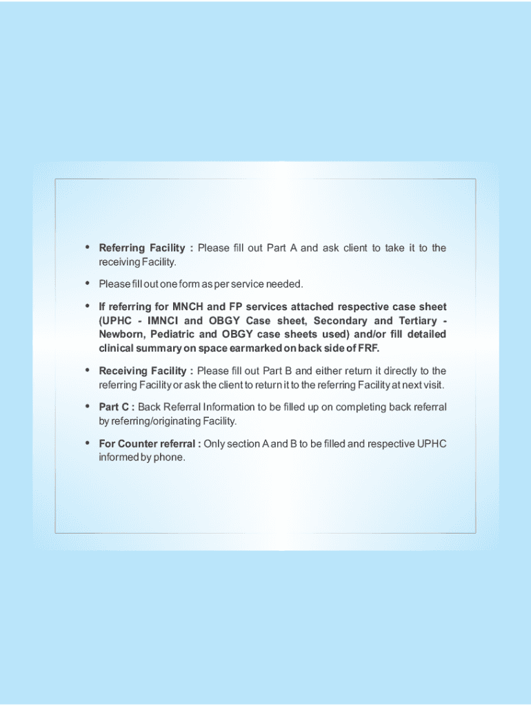 Referring Facility : Please ll out Part A and ask client to take it to the receiving Facility. Please ll out one form as per service needed. If referring for MUCH and FP services attached respective