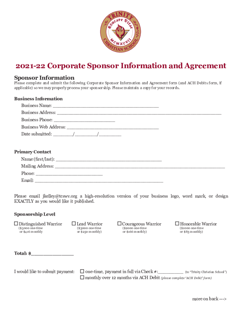 202122 Corporate Sponsor Information and Agreement Sponsor InformationPlease complete and submit the following Corporate Sponsor Information and Agreement form (and ACH Debits form, if applicable)