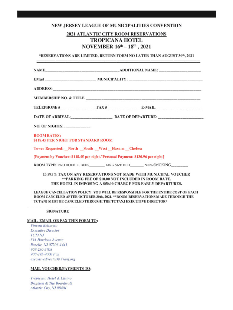 NEW JERSEY LEAGUE OF MUNICIPALITIES CONVENTION 2021 ATLANTIC CITY ROOM RESERVATIONSTROPICANA HOTEL NOVEMBER 16th 18th, 2021 *RESERVATIONS ARE LIMITED, RETURN FORM NO LATER THAN AUGUST 30th, 2021 NAME