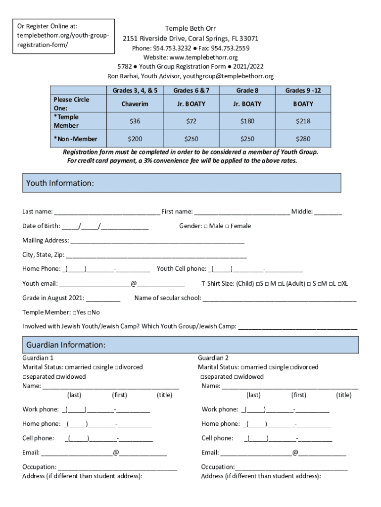 Or Register Online at: templebethorr.org/youthgroupregistrationform/Temple Beth Orr 2151 Riverside Drive, Coral Springs, FL 33071Phone: 954.753.3232 Fax: 954.753.2559 Website: www.templebethorr.org