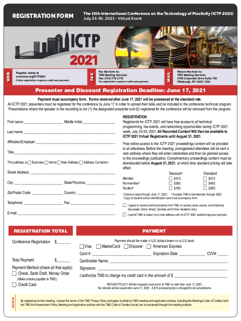 Online registration requires credit card payment. Fax this form to: TMS Meeting Services Fax: (724) 7763770Fax registration requires credit card payment.MAILWEBRegister online at www.tms.org/ICTP2021The
