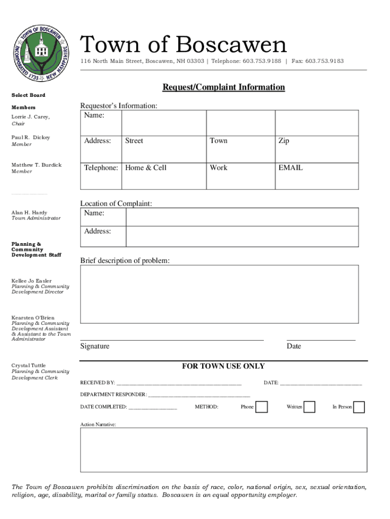 Town of Boscawen116 North Main Street, Bowen, NH 03303 | Telephone: 603.753.9188 | Fax: 603.753.9183Select Board Members Lorrie J. Carey ChairComplaint/Violation Request Paul R. Dickey Member Matthew