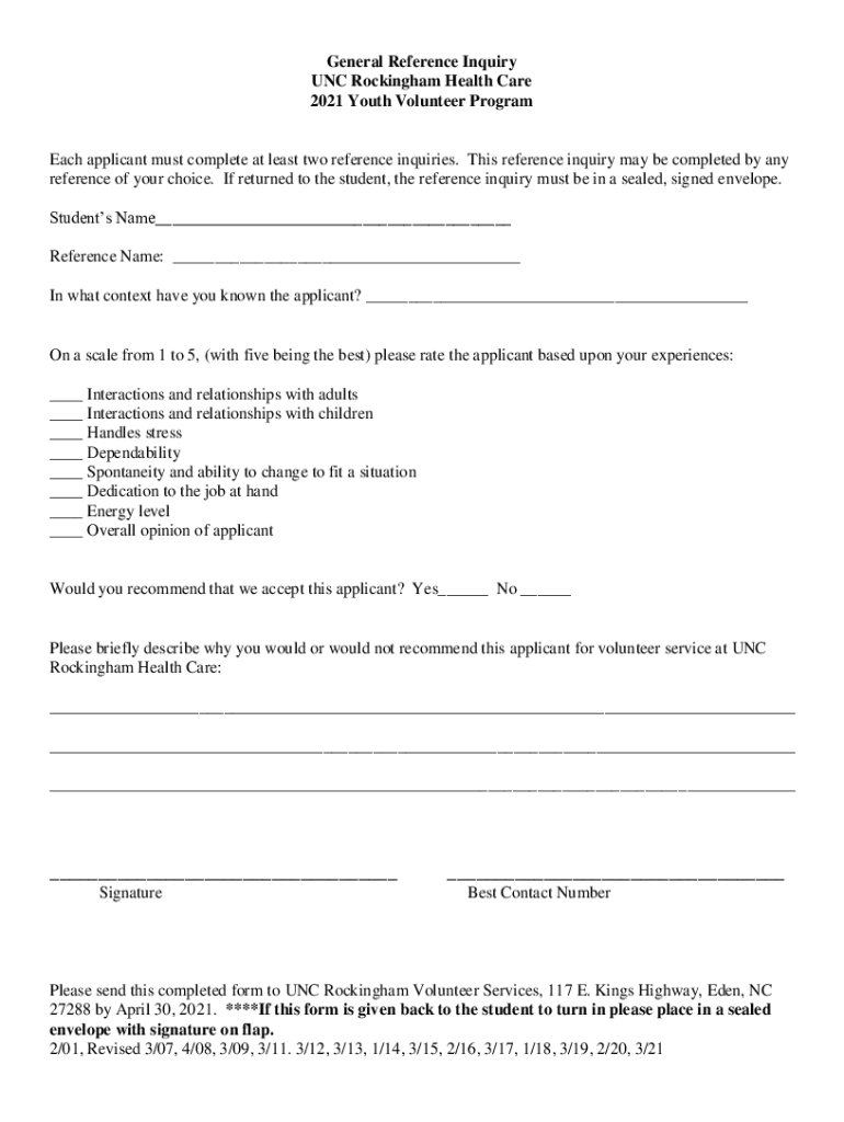 General Reference Inquiry UNC Rockingham Health Care 2021 Youth Volunteer ProgramEach applicant must complete at least two reference inquiries. This reference inquiry may be completed by any reference