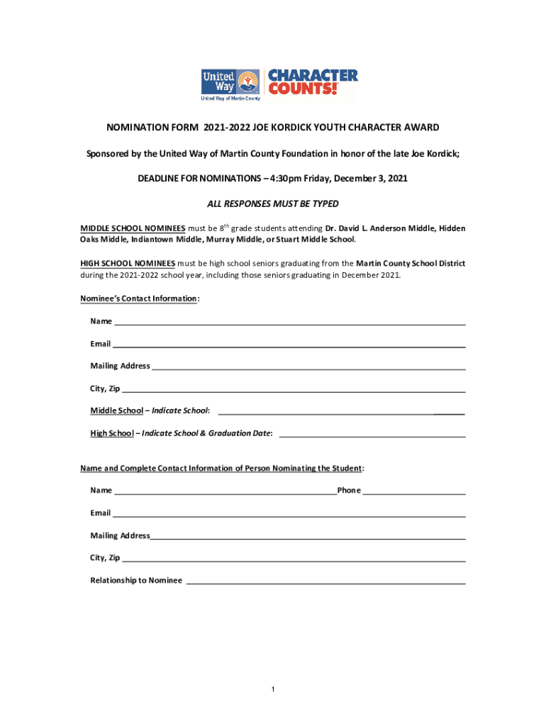 NOMINATION FORM 20212022 JOE NORDIC YOUTH CHARACTER AWARD Sponsored by the United Way of Martin County Foundation in honor of the late Joe Nordic; DEADLINE FOR NOMINATIONS 4:30pm Friday, December
