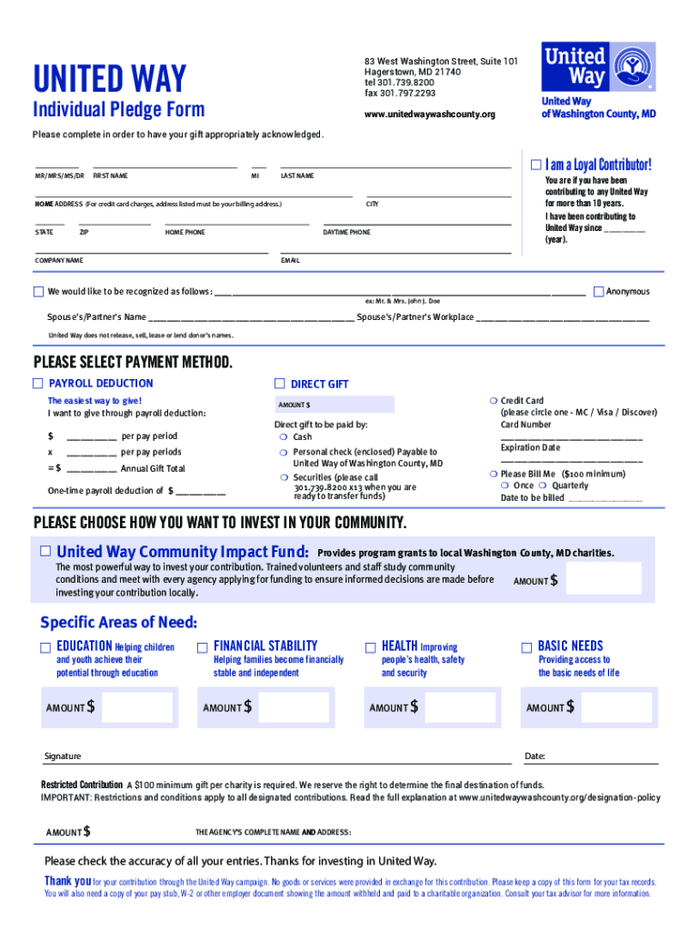 83 West Washington Street, Suite 101 Hagerstown, MD 21740 tel 301.739.8200 fax 301.797.2293UNITED Individual Pledge Form.unitedwaywashcounty.release complete in order to have your gift appropriately