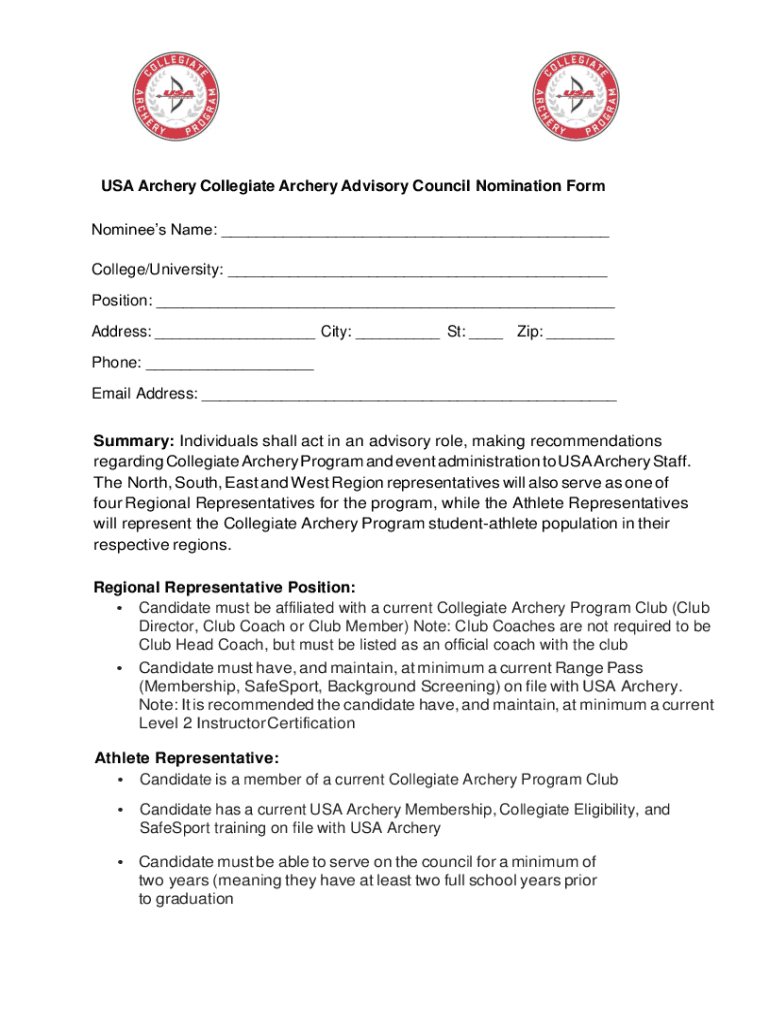 USA Archery Collegiate Archery Advisory Council Nomination Form Nominees Name: College/University: Position: Address: City: St: Zip: Phone: Email Address: Summary: Individuals shall act in an advisory