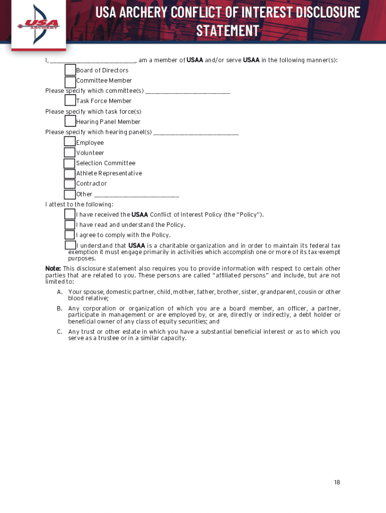 USA ARCHERY CONFLICT OF INTEREST DISCLOSURE STATEMENT I, am a member of the USA and/or serve USA in the following manner(s): Board of Directors Committee Member Please specify which committee(s) Task