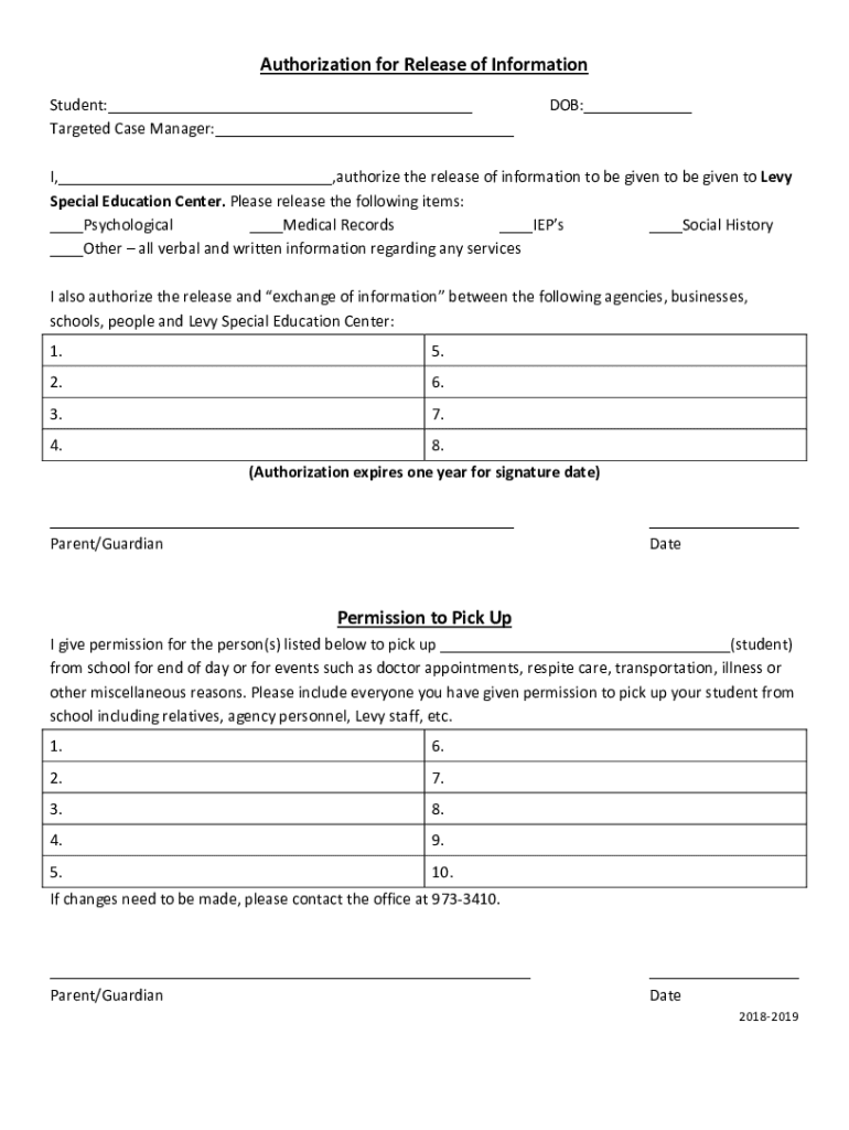 Authorization for Release of Information Student: Targeted Case Manager: DOB: I, authorize the release of information to be given to be given to Levy Special Education Center. Please release the following