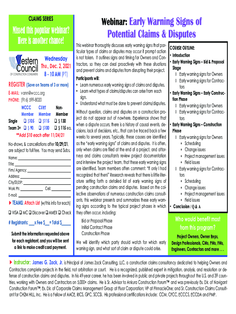 CLAIMS SERIESMissed this popular webinar? Here is another chance! Thu., Dec. 2, 2021 8 10 AM (PT)REGISTER(Save on Teams of 3 or more)EMAIL: van WCCC.org PHONE: (916) 5998020 WCCC Member Single $105