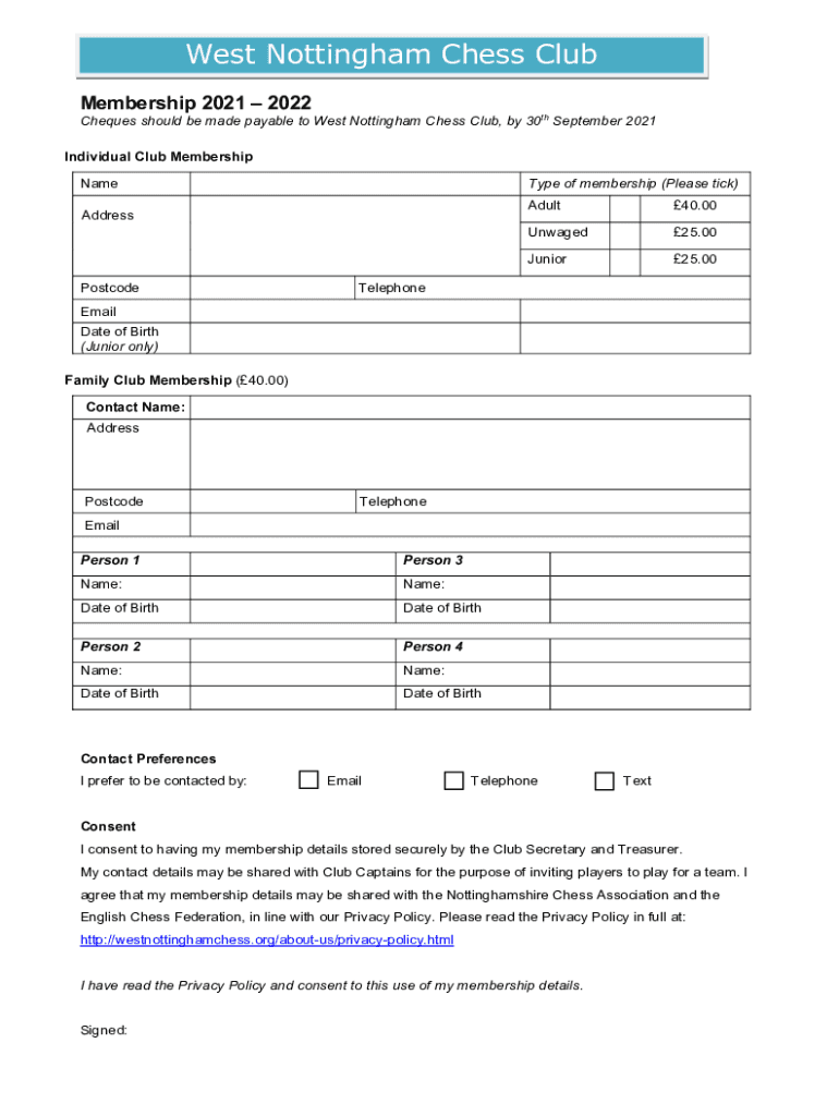 West Nottingham Chess Club Membership 2021 2022Cheques should be made payable to West Nottingham Chess Club, by 30th September 2021 Individual Club Membership Namely of membership (Please tick)AddressPostcodeAdult40.00Unwaged25.00Junior25.00TelephoneEmail