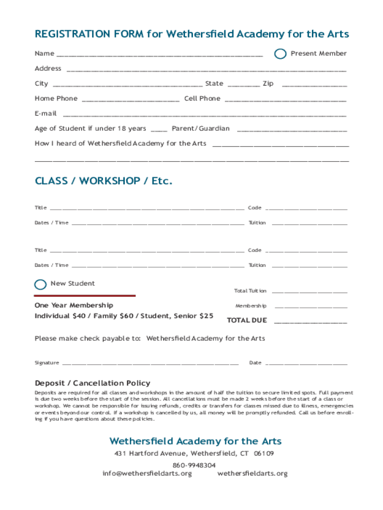 REGISTRATION FORM for Wethersfield Academy for the Arts Name Present MemberAddress City State Zip Home Phone Cell Phone Email Age of Student if under 18 years Parent/Guardian How I heard of Wethersfield