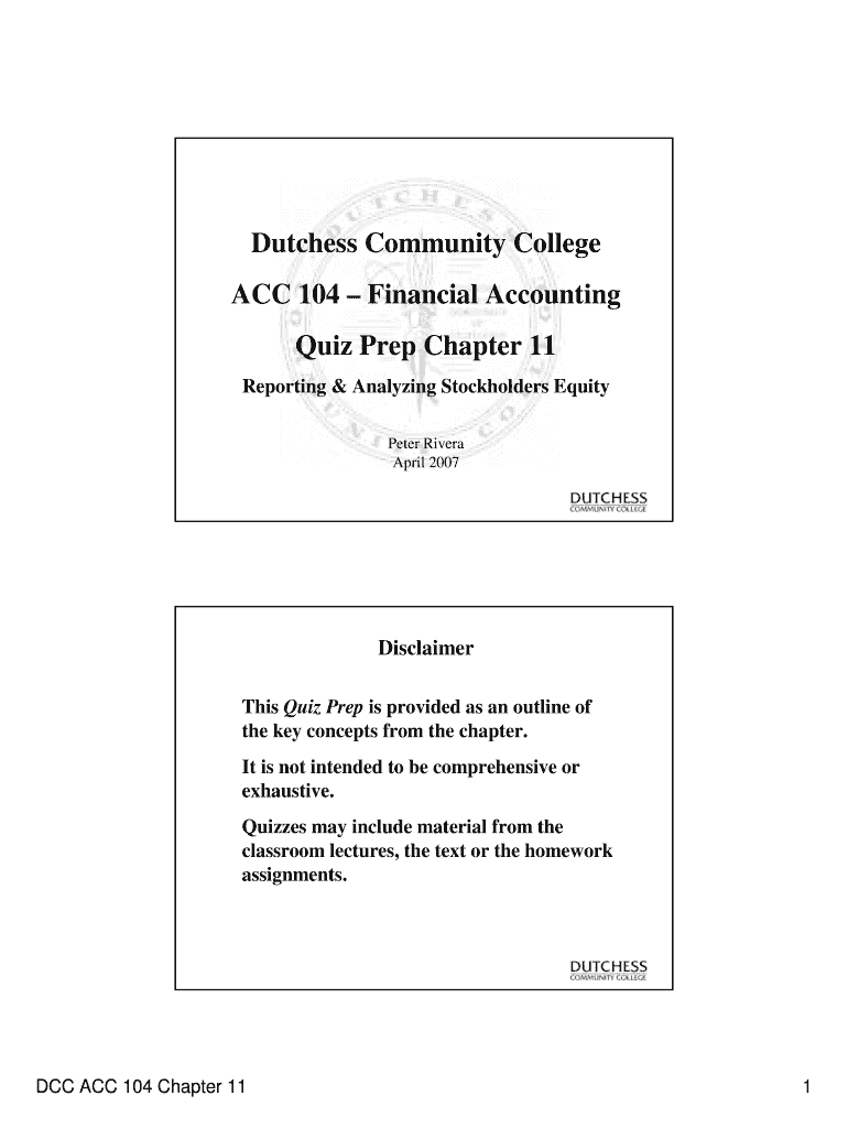 Duchess Community College ACC 104 Financial Accounting Quiz Prep Chapter 11 Reporting & Analyzing Stockholders Equity Peter Rivera April 2007Disclaimer This Quiz Prep is provided as an outline of