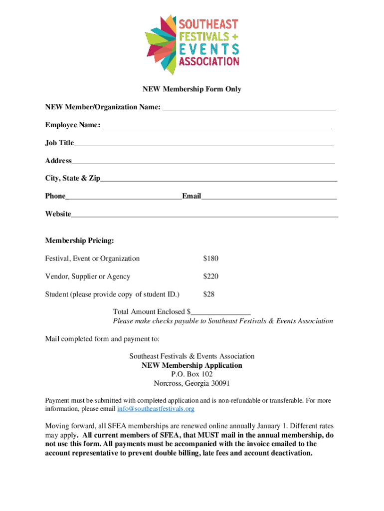 NEW Membership Form Only NEW Member/Organization Name: Employee Name: Job Title Address City, State & Zip Phone Email Website Membership Pricing: Festival, Event or Organization$180Vendor, Supplier