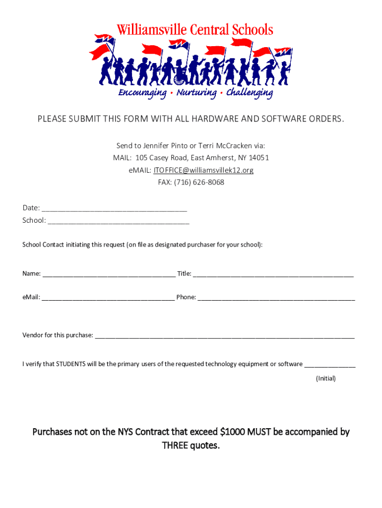 PLEASE SUBMIT THIS FORM WITH ALL HARDWARE AND SOFTWARE ORDERS. Send to Jennifer Pinto or Terri McCracken via: MAIL: 105 Casey Road, East Amherst, NY 14051 email: OFFICE williamsvillek12.org FAX: (716)