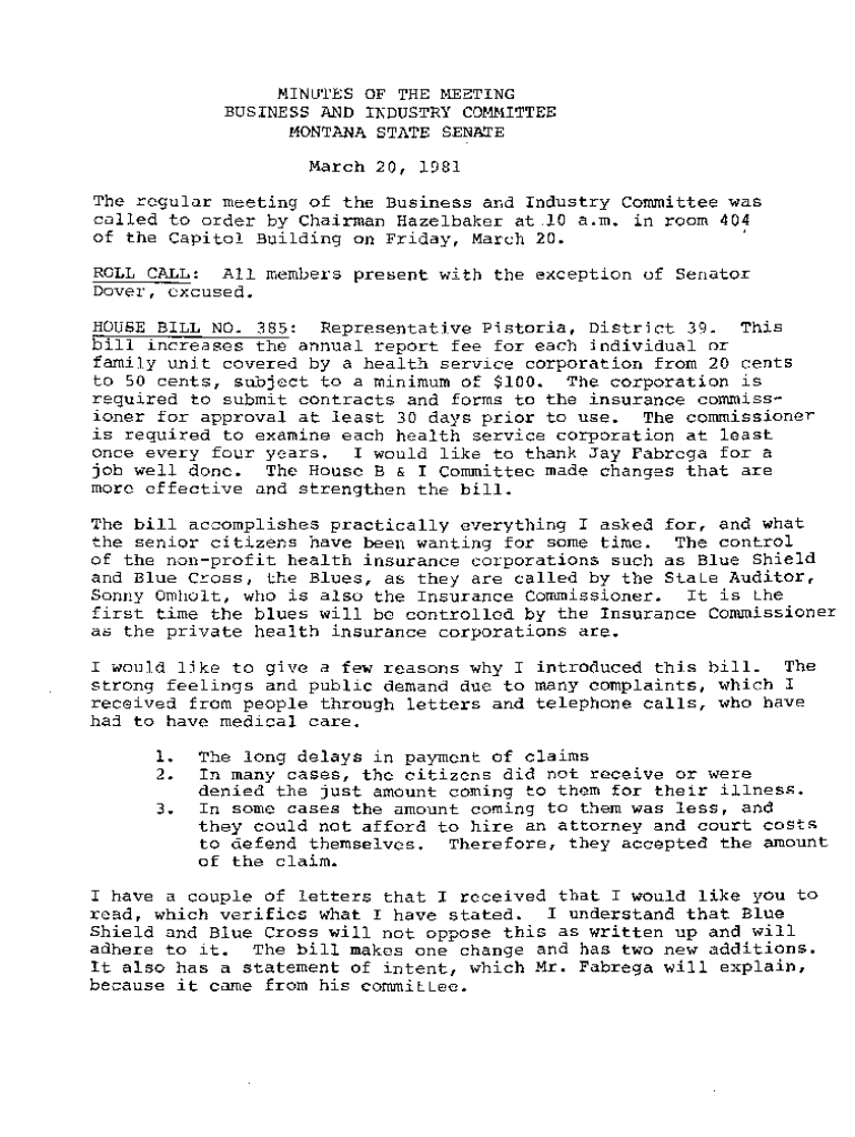 MINUTES OF THE MEETING BUSINESS AND INDUSTRY COMMITTEE MONTANA STATE SEE March 20, 1981, The regular meeting of the Business and Industry Committee was called to order by Chairman Hazel baker at 10