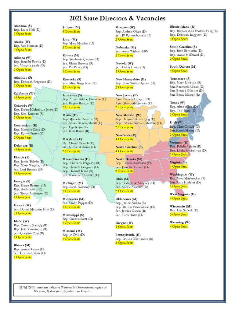 2021 State Directors & Vacancies Alabama (S) Rep. Laura Hall (D) 3 Open Seats Alaska (W) Rep. Sara Hanna (D) 3 Open Seats Indiana (M) 4 Open Seats Iowa (M) Rep. Mary Marcher (D) 3 Open Seats Montana