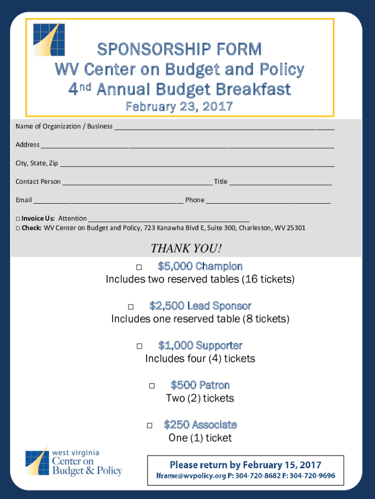 SPONSORSHIP FORM WV Center on Budget and Policy 4 ND Annual Budget Breakfast February 23, 2017, Four Points Sheraton, Charleston, WV Name of Organization / Business Address City, State, Zip Contact