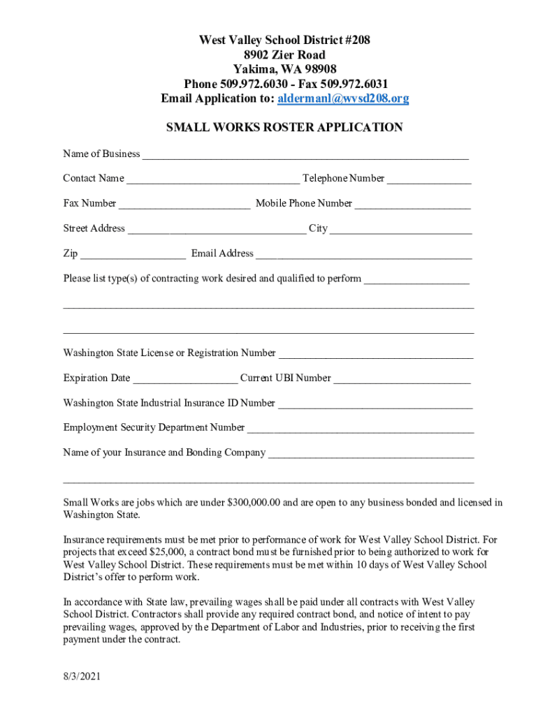 West Valley School District #208 8902 Year Road Yakima, WA 98908 Phone 509.972.6030 Fax 509.972.6031 Email Application to: alderman wvsd208.org SMALL WORKS ROSTER APPLICATION Name of Business Contact
