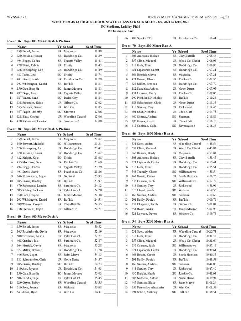 ISSAC 1HyTek\'s MEET MANAGER 5:38 PM 6/5/2021-Page 1 WEST VIRGINIA HIGH SCHOOL STATE CLASS TRACK MEET 6/9/2021 to 6/10/2021 UC Stadium, Bailey Field Performance List 16Event 16 Boys 100 Meter Dash