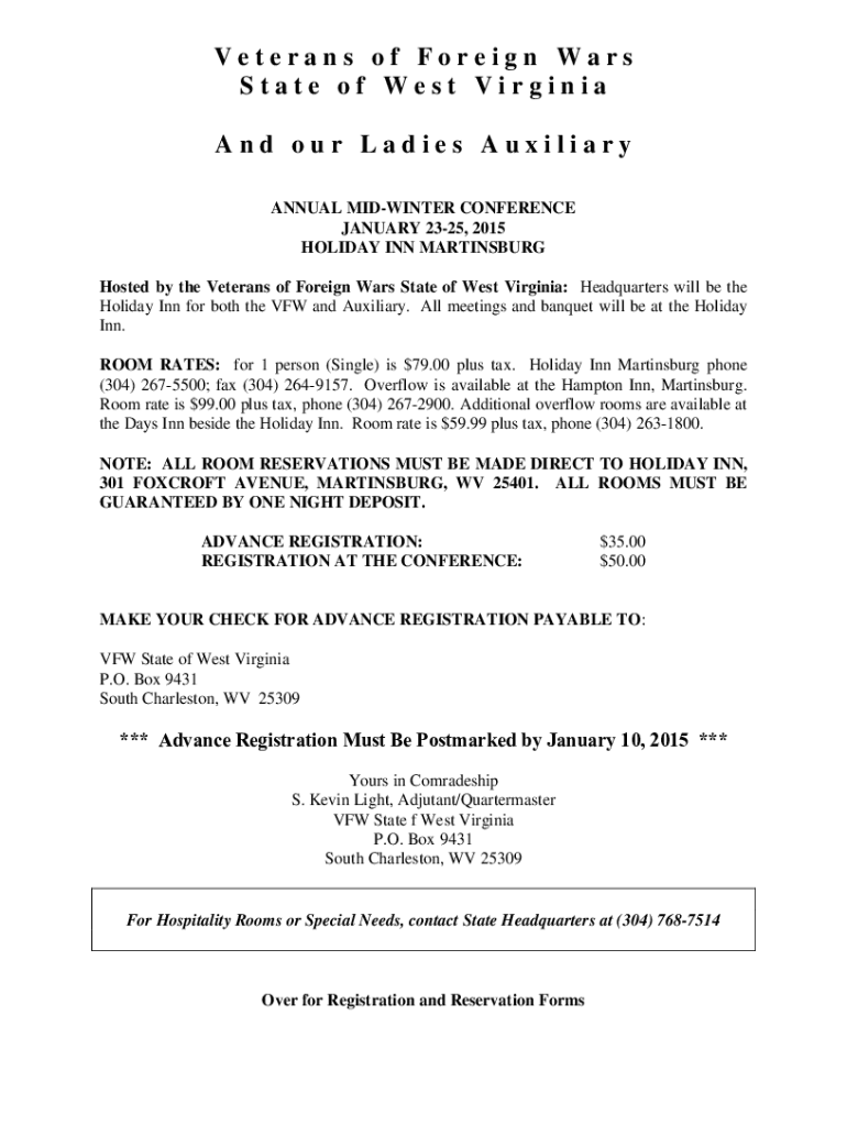 Veterans of Foreign Wars State of West Virginia And our Ladies Auxiliary ANNUAL MIDWINTER CONFERENCE JANUARY 2325, 2015 HOLIDAY INN MARTINSBURG Hosted by the Veterans of Foreign Wars State of West