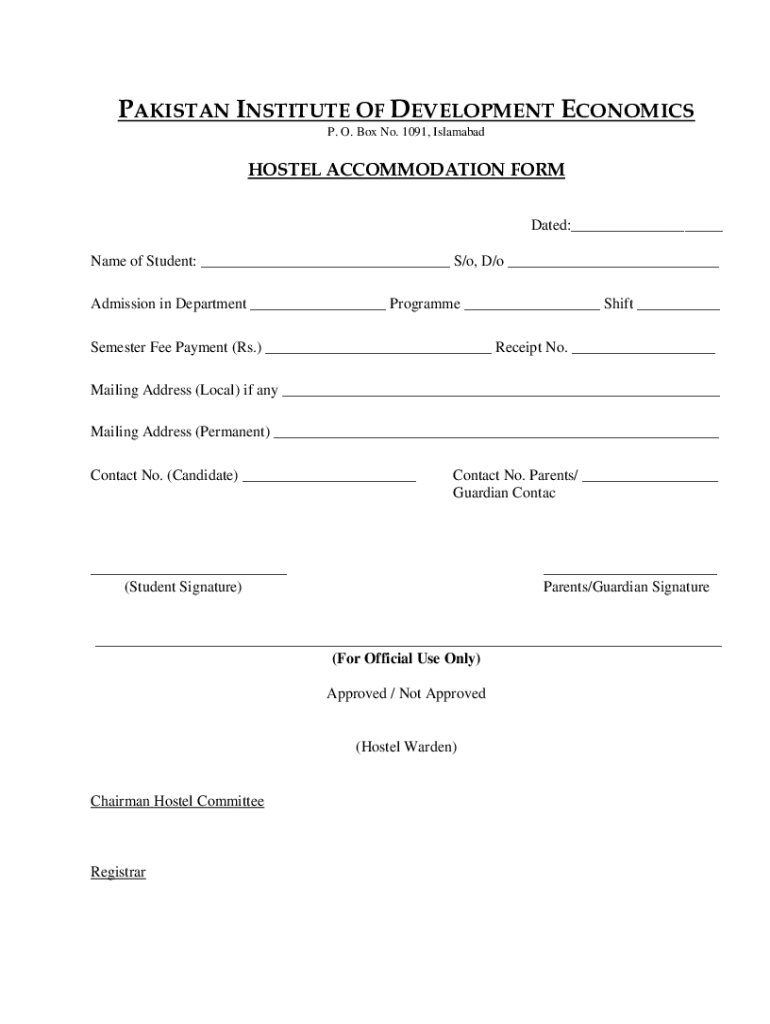 PAKISTAN INSTITUTE OF DEVELOPMENT ECONOMICS P. O. Box No. 1091, IslamabadHOSTEL ACCOMMODATION FORM Dated: Name of Student: S/o, D/o Admission in Department Program Shift Semester Fee Payment (Rs.)