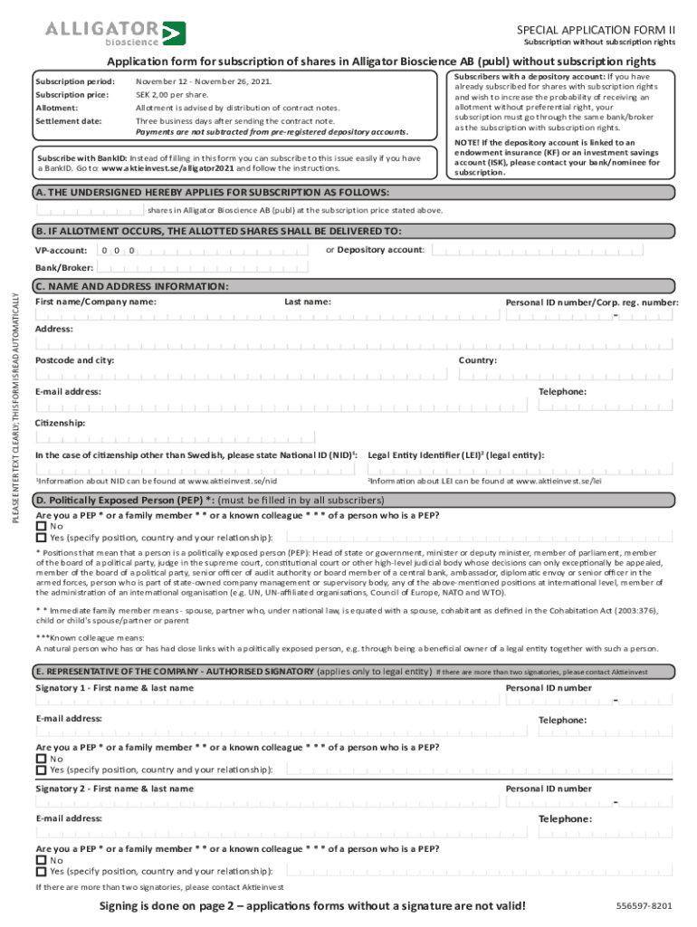 SPECIAL APPLICATION FORM II Subscription without subscription rightsApplication form for subscription of shares in Alligator Bioscience AB (pub) without subscription rights Subscription period: Subscription