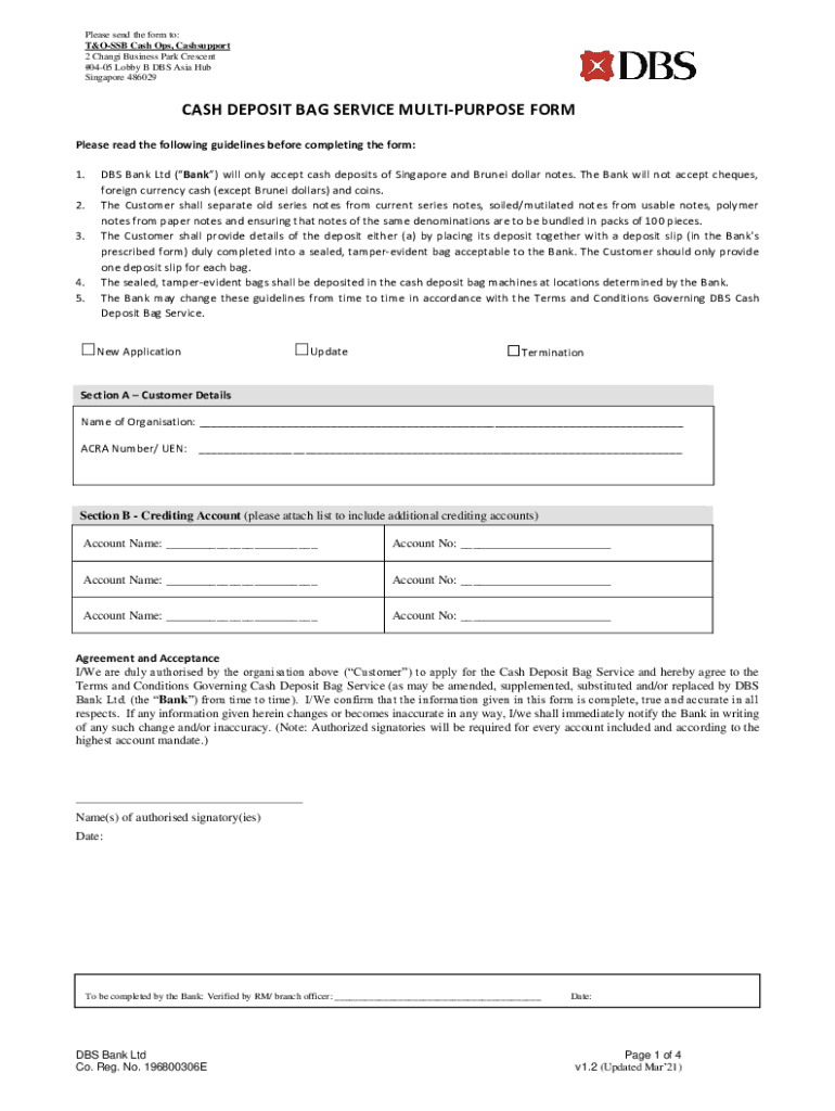 Please send the form to: TOSS Cash Ops, Cash support 2 Change Business Park Crescent #0405 Lobby B DBS Asia Hub Singapore 486029CASH DEPOSIT BAG SERVICE MULTIPURPOSE FORM Please read the following