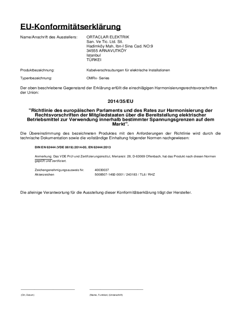 EUKonformittserklrung Name/Antichrist DES Bestsellers:ORACULAR ELECTRIC San. Ve Tic. Ltd. STI. Heyday MAH, BNI Sing Cad. NO:9 34555 ARNAVUTKY Istanbul TRKEIProduktbezeichnung:Kabelverschraubungen