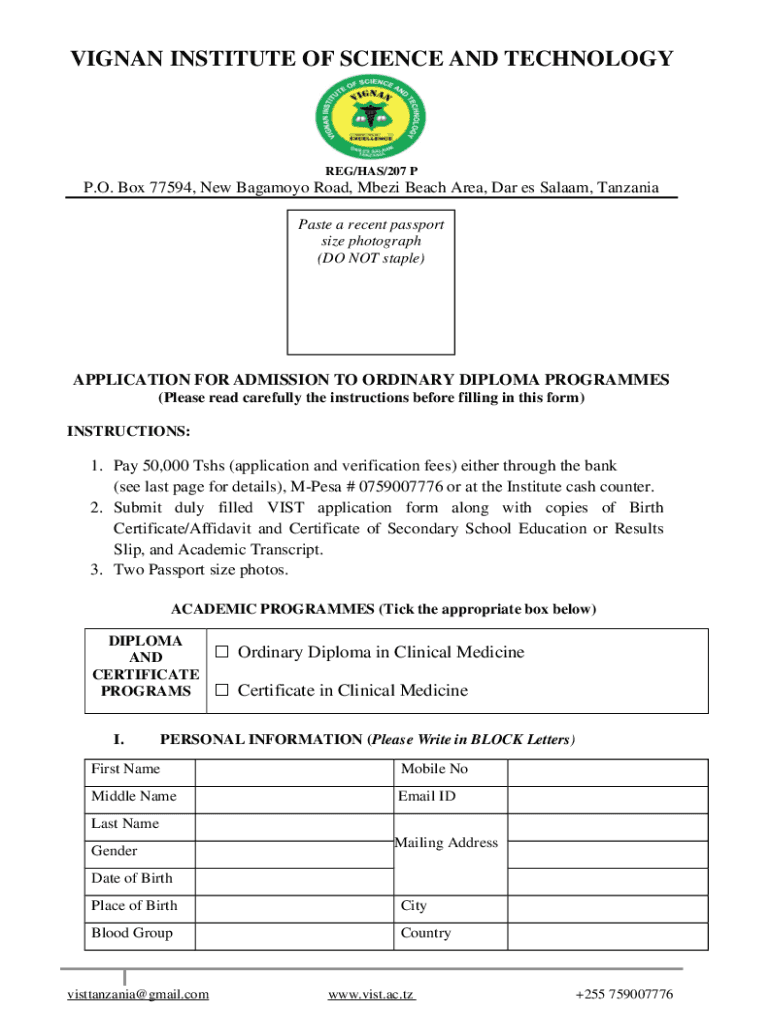 SIGNAL INSTITUTE OF SCIENCE AND TECHNOLOGY REG/HAS/207 PP. O. Box 77594, New Bigamy Road, Zambezi Beach Area, Dar es Salaam, Tanzania Paste a recent passport size photograph (DO NOT staple)APPLICATION