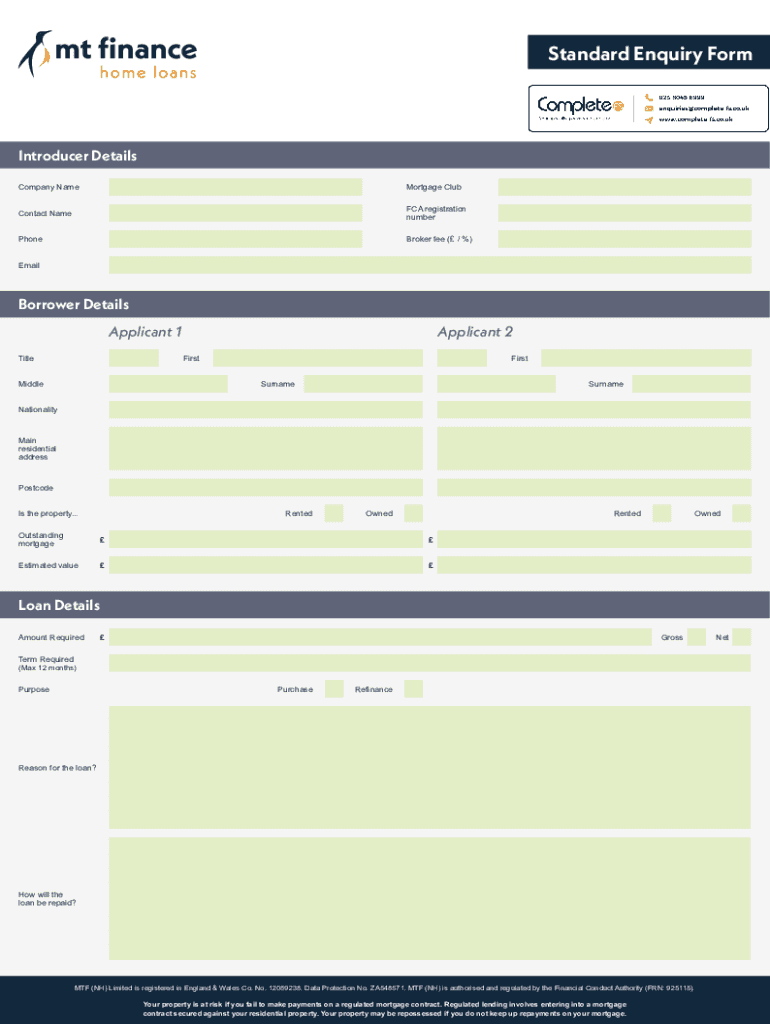 Standard Inquiry FormIntroducer Details Company Remortgage Subcontract Name FCA registration numberPhoneBroker fee (/ %)Paradigm Mortgages None MCIEmailBorrower Details Applicant 1 TitleApplicant