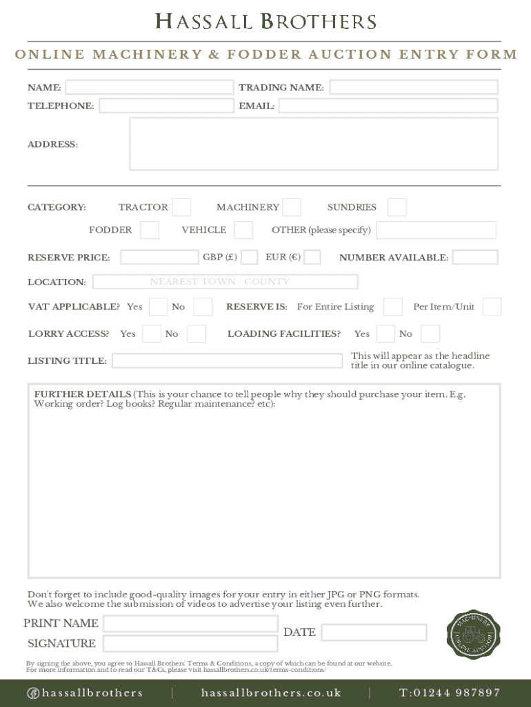 ONLINE MACHINERY & FODDER AUCTION ENTRY FORM NAME:TRADING NAME:TELEPHONE:EMAIL:ADDRESS:TRACTORCATEGORY:MACHINERYFODDERVEHICLEEUR ()NUMBER AVAILABLE:NEAREST TOWN / COUNTYLOCATION: VAT APPLICABLE? Yes
