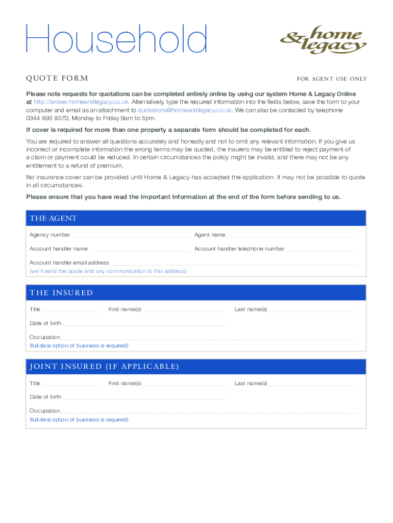 Household QUOT E FORM for agent use on please note requests for quotations can be completed entirely online by using our system Home & Legacy Online at http://broker.homeandlegacy.co.uk. Alternatively,
