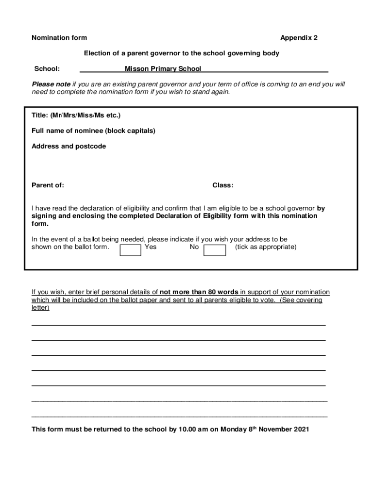 Get the free Nomination form Election of a Parent Governor to the ... - missonprimary co