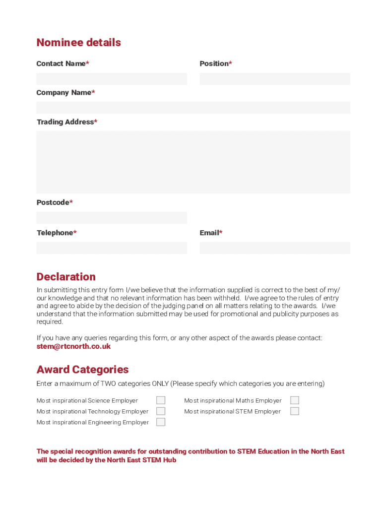 North East virtual STEM Awards 2021 Thursday 15th July 7:30 10:00pmENTRY FORM A prestigious awards' ceremony which celebrates and recognizes North East STEM Ambassadors and STEM organizations who,