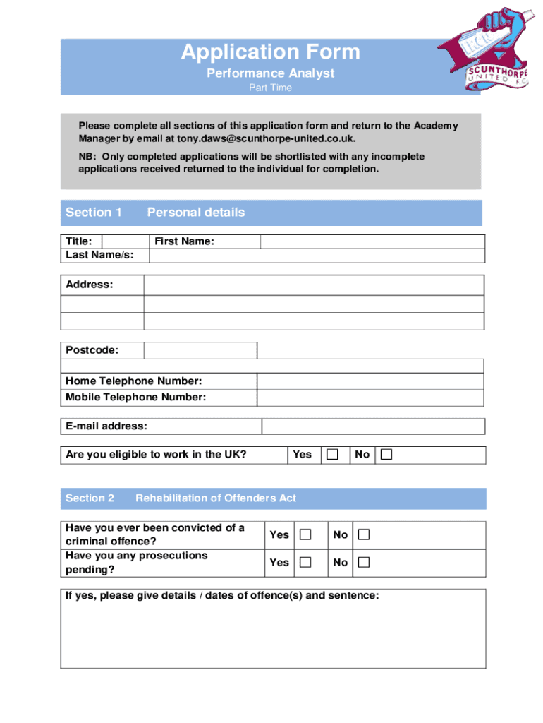 Application Form Performance Analyst Part Timeless complete all sections of this application form and return to the Academy Manager by email at tony.daws@scunthorpeunited.co.uk. NB: Only completed