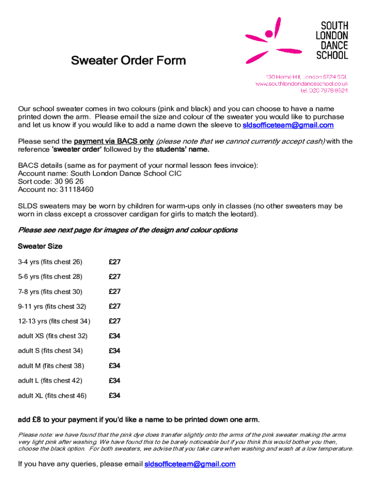 Get the free SLDS SWEATER ORDER FORM 20192021 - southlondondancestudios co