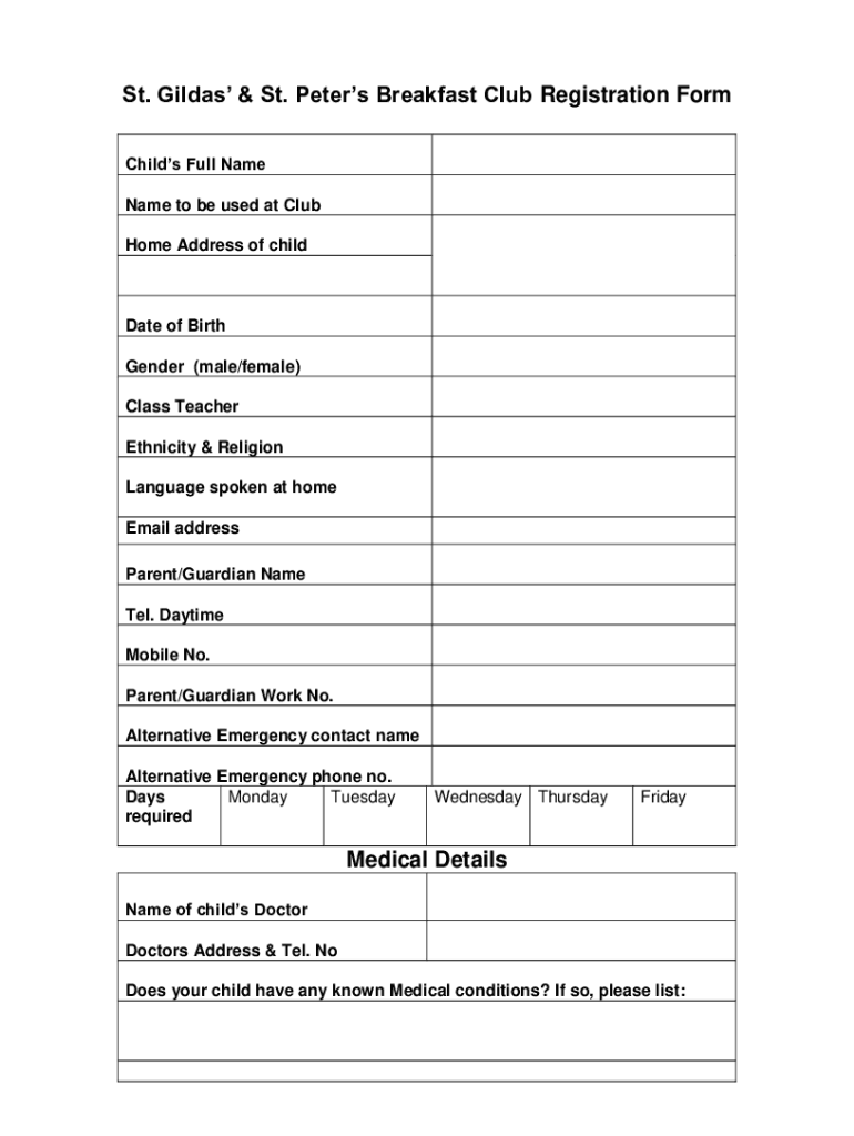St. Gilda's & St. Peters Breakfast Club Registration Form Child's Full Name to be used at Club Home Address of childcare of Birth Gender (male/female) Class Teacher Ethnicity & Religion Language spoken