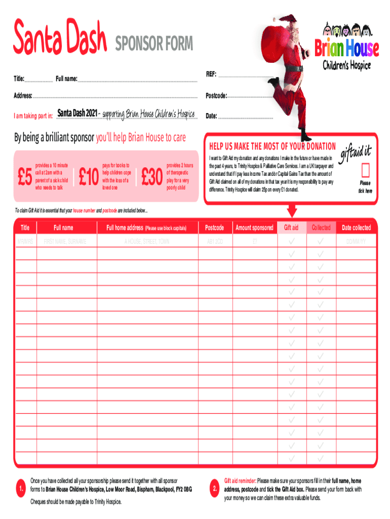 Santa Dash Title:SPONSOR FORM REF:Full name:Address:Postcode:I am taking part in:Santa Dash 2021 supporting Brian House Children's Hospice being a brilliant sponsor you'll help Brian House to care5provides