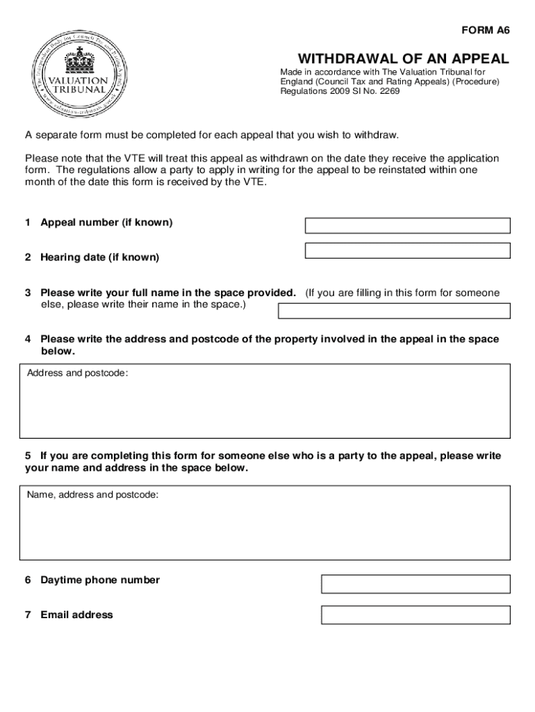 FORM A6WITHDRAWAL OF AN APPEAL Made in accordance with The Valuation Tribunal for England (Council Tax and Rating Appeals) (Procedure) Regulations 2009 SI No. 2269A separate form must be completed
