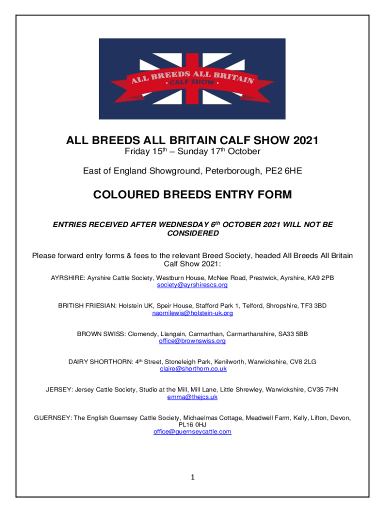 ALL BREEDS ALL BRITAIN CALF SHOW 2021 Friday 15th Sunday 17th October East of England Showground, Peterborough, PE2 6HECOLOURED BREEDS ENTRY FORM ENTRIES RECEIVED AFTER WEDNESDAY 6th OCTOBER 2021