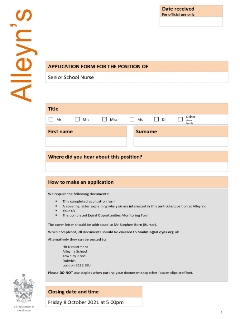 Allendale received official use onlyAPPLICATION FORM FOR THE POSITION OF Senior School NurseTitleMrMrsMissFirst nameMsDrOther Please SpecifySurnameWhere did you hear about this position? How to make