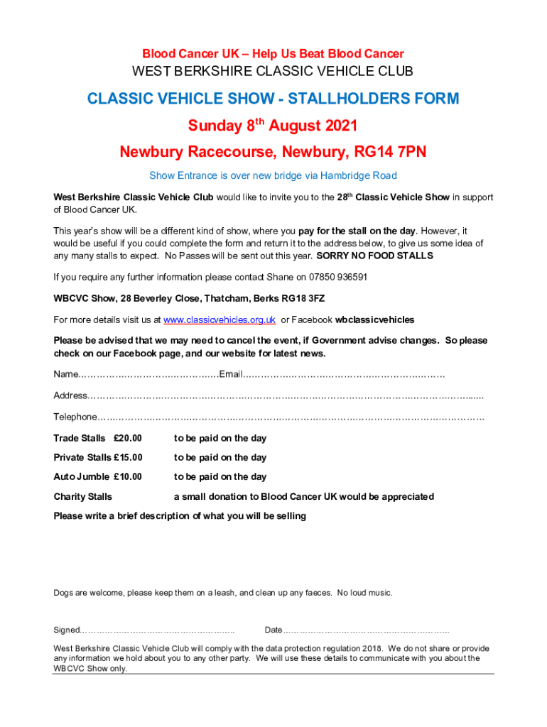 Blood Cancer UK Help Us Beat Blood Cancers BERKSHIRE CLASSIC VEHICLE CLUBCLASSIC VEHICLE SHOW STALLHOLDERS FORM Sunday 8th August 2021 Newbury Racecourse, Newbury, RG14 7 PNS how Entrance is over