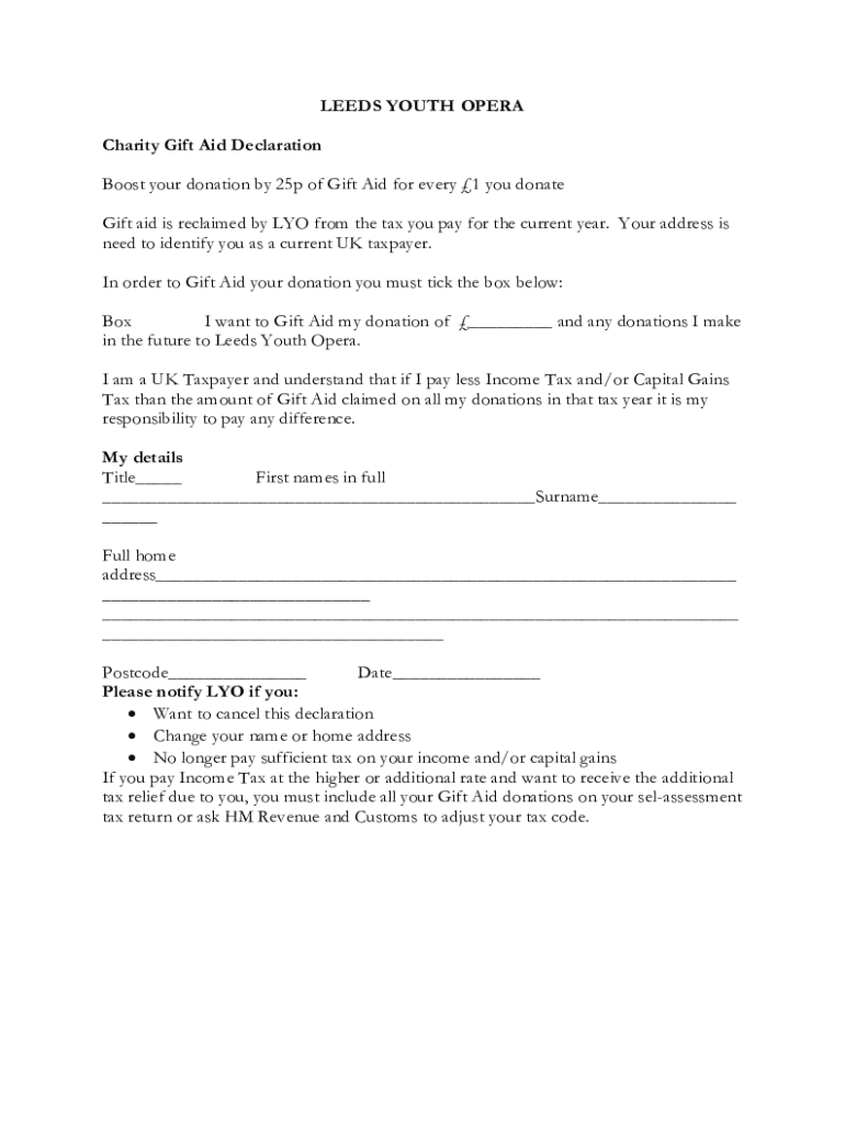 LEEDS YOUTH OPERA Charity Gift Aid Declaration Boost your donation by 25p of Gift Aid for every 1 you donate Gift aid is reclaimed by LYON from the tax you pay for the current year. Your address is