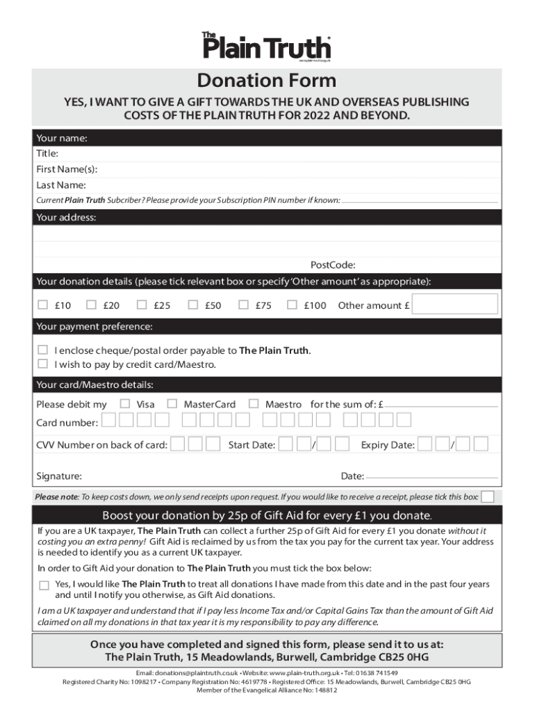WWW.plain truth.org.donation Form YES, I WANT TO GIVE A GIFT TOWARDS THE UK AND OVERSEAS PUBLISHING COSTS OF THE PLAIN TRUTH FOR 2022 AND BEYOND. Your name: Title: First Name(s): Last Name: Current