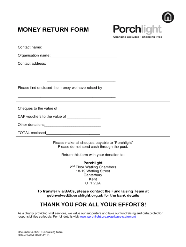 MONEY RETURN FORM Contact name: Organization name: Contact address: Please find enclosed the money we have raised by Checks to the value of CAF vouchers to the value of Other donations TOTAL enclosed