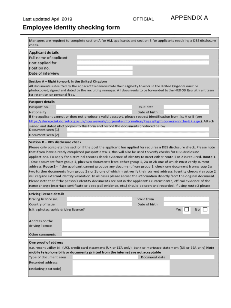 Last updated April 2019OFFICIALAPPENDIX Employee identity checking form Managers are required to complete section A for ALL applicants and section B for applicants requiring a DBS disclosure check.